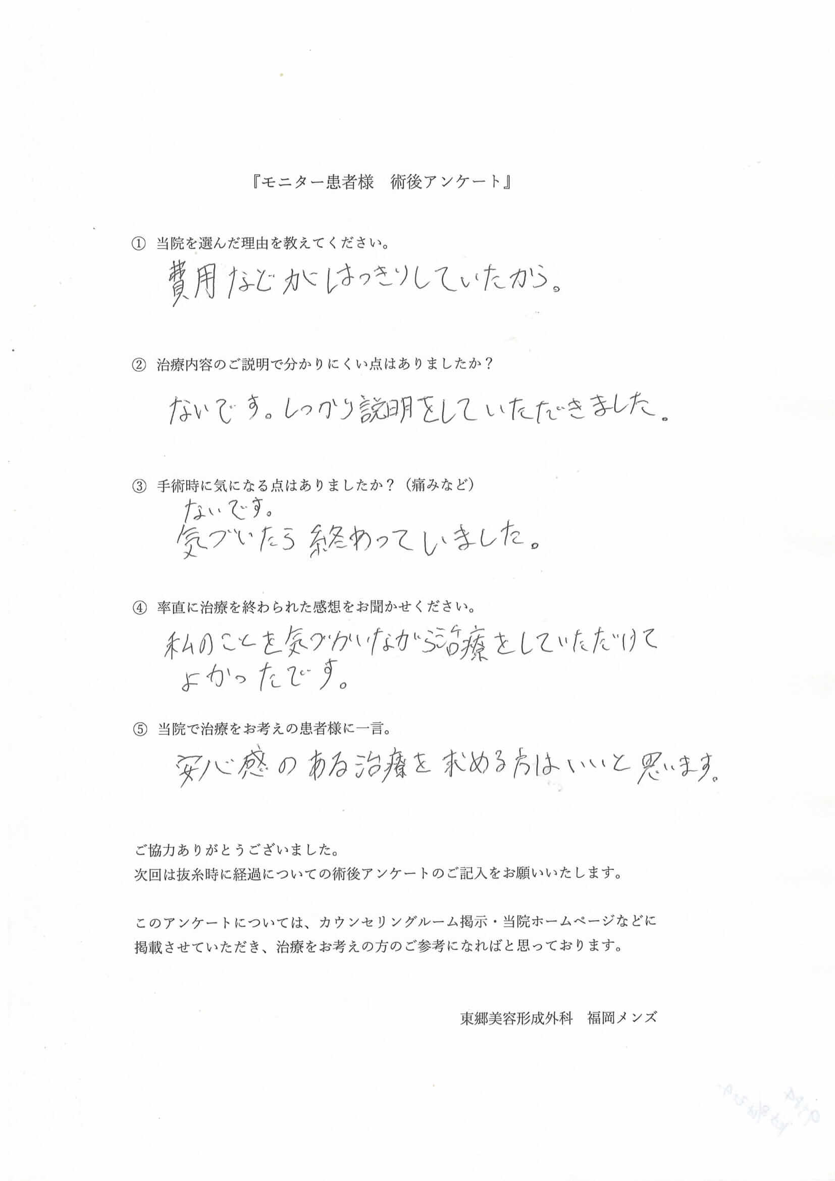 そのため、当院の術後アンケートおよびGoogle口コミについてですが、切る治療においては全て抜糸時にご協力いただいているものとなります。