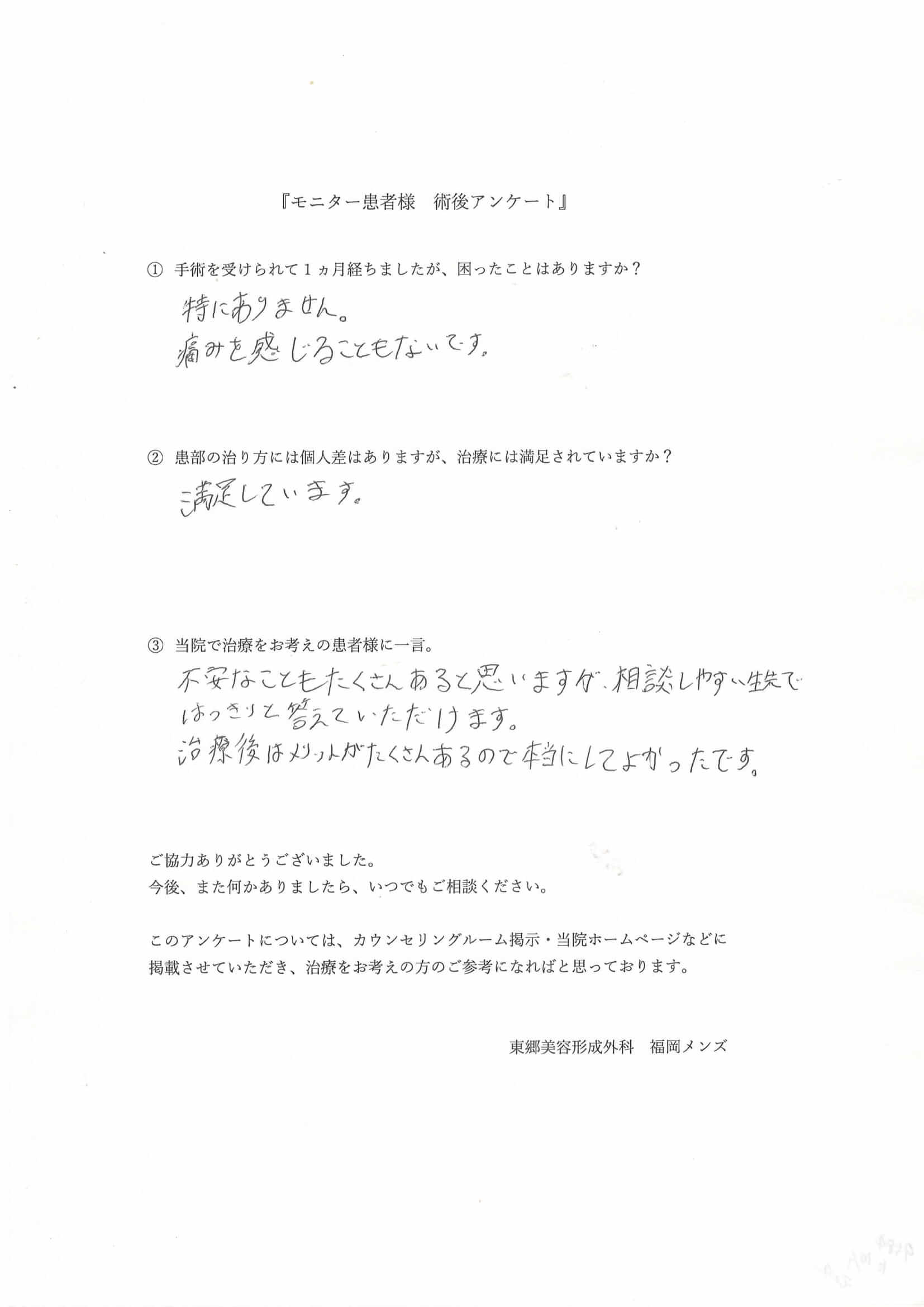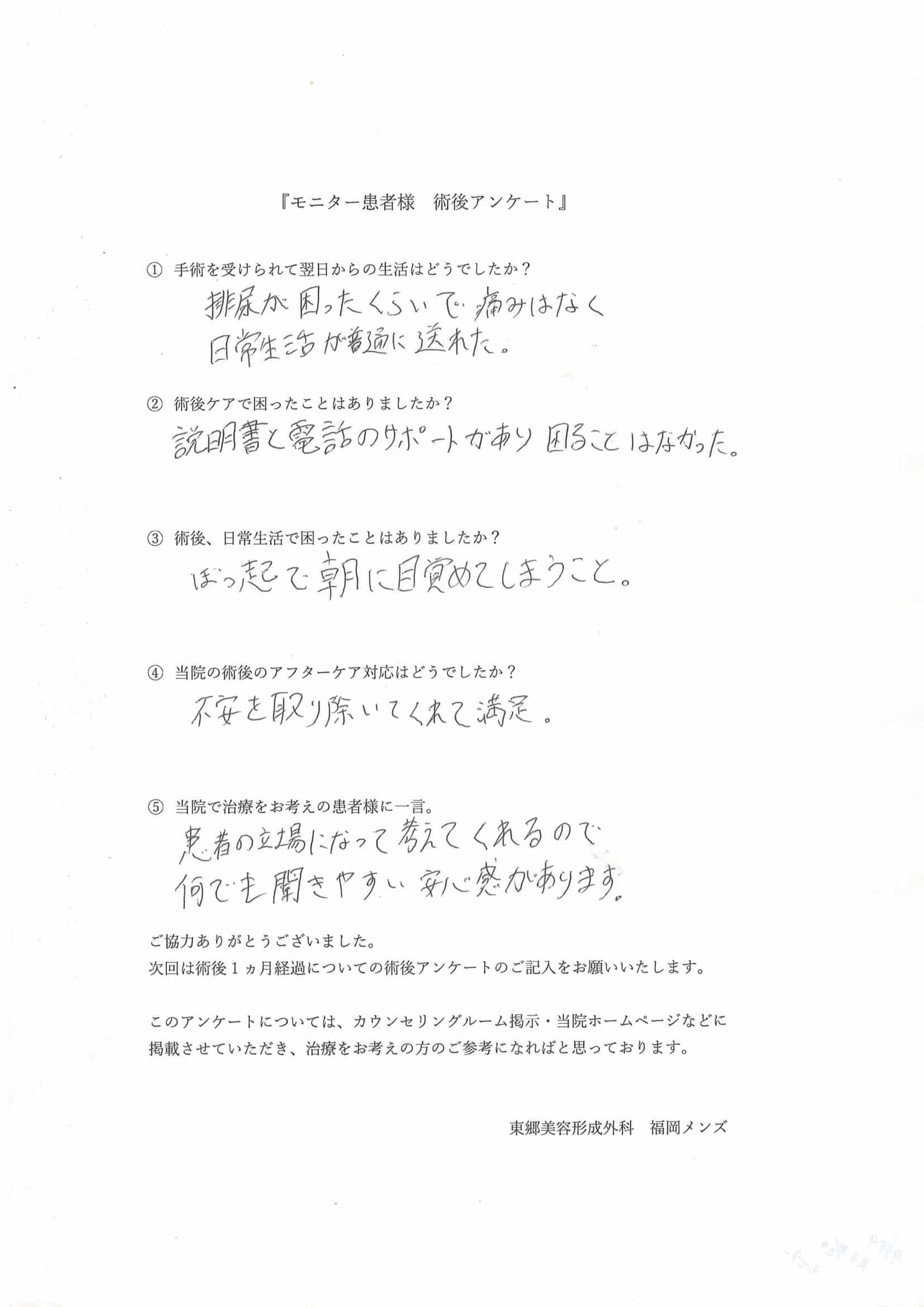 モニター患者の手術費用ですが、患者様の状態(仮性・カントン・真性)に合わせて、すべて定額料金で治療を行っておりました。そのため、ペニスの状態により異なりますが、傷痕が目立ちにくい亀頭下での手術で対応。多くの方が気にされている、包皮小帯と呼ばれる裏すじの処置も含めて全て定額料金に含まれていました。